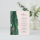 The left-hand edge of this elegant modern wedding menu features an emerald green watercolor agate border trimmed with faux rose gold glitter. The customisable text combines whimsical charcoal grey handwriting script and copperplate fonts on a blush pink background. The reverse side features a matching emerald green and rose gold agate design.