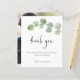 Elegant Eucalyptus Leaf Script Photo Thank You. A budget price SMALLER 4.5” x 5.6” alternative. Available in a SEMI-GLOSS 110 lb CARD STOCK which is the default option (thicker for invitations), OR a SATIN FINISH 80 lb THINNER PAPER STOCK (ideal for enclosures). Envelopes are an optional extra and are slightly larger than the card size. An elegant branch of green eucalyptus leaves flows partially across from the right hand side, with set typography Thank You in a modern handwritten style. On the back, swap in your favourite photo from your day (of portrait orientation). The rest of the text on the front you can easily personalise to your own words.
