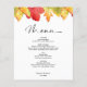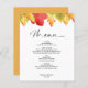 Celebrate your autumn wedding in style without compromising your budget with this Budget Fall Leaves Wedding Menu. Featuring charming illustrations of warm-toned fall foliage, this menu design captures the cosy, rustic beauty of the season while offering an affordable way to elevate your reception tables. The easy-to-read layout elegantly lists each course, adding a thoughtful touch that guides guests through the dining experience. It’s the perfect solution for couples looking to create a cohesive, seasonal look without overspending.