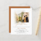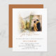 A value for money BUDGET alternative on a smaller size 4.5 x 5.6” semi-gloss 110lbs weight, which is of similar thickness to a postcard (however is not suitable to use as a postcard.). PLEASE NOTE there is ONE invite per sheet. Budget Watercolor Fall Trees Photo QR Join Us Wedding Terracotta Invitation. Simply replace the sample photo with your own and personalise with your details. Join Us is in a stylish set handwritten style with a matching soft autumn terracotta line border around your photo and for your names, and a watercolor scene of a road with trees in fall colours is placed behind your picture. The same shade of terracotta is on the back. Add your QR code to your wedding website on the back makes this a convenient option for your guests to RSVP and see all the details without the need for separate RSVP and details cards. You can create QR codes for free online. Simply search “QR code creator” and lots of options come up to create for free.