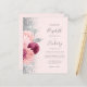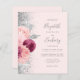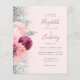 The left-hand edge of this elegant modern wedding invitation features a floral bouquet in shades of burgundy and blush pink, trimmed with silver faux foil and faux glitter foliage and sprinkled with silver faux glitter. The customisable text combines grey handwriting script, copperplate and italic fonts on a blush background. Add additional details on the back, along with a QR code to help your guests visit your wedding website.