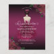 This elegant budget Quinceañera invitation features girl in plum purple gown with purple and gold floral accents. Back features purple and gold rose pattern. Easy to customise by clicking "Personalise".