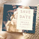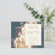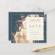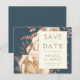 This elegant wedding Save the Date card features a lush, romantic floral bouquet in ivory with rose gold faux foil and glitter foliage on a teal blue background. Customise the rose-coloured text in stylish fonts on an ivory rectangle, and add your wedding website URL to the solid teal back.