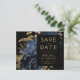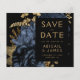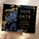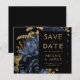 This elegant, moody wedding Save the Date card features a lush, romantic floral bouquet in navy blue with gold faux foil and glitter foliage on a black background. Customise the gold-coloured text in stylish fonts on a black rectangle, and add your wedding website URL to the solid black back.