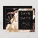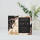 This elegant, moody wedding Save the Date card features a lush, romantic floral bouquet in ivory with rose gold faux foil and glitter foliage on a black background. Customise the rose-coloured text in stylish fonts on a black rectangle. Add additional details on the back, and enter your wedding website URL to generate a QR code.