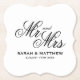 Budget friendly design custom Mr and Mrs wedding Paper Coaster . Elegant paper coasters in unique shapes. Classy designer template with stylish script typography. Trendy party table decorations for couples getting married. Change quantity to get the cheapest bulk price. Timeless traditional typography example.