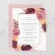 Elegant celebration of a life invitation features deep burgundy and dusty pink roses as well as golden ivory hydrangeas decorating a gold frame. The deceased person's name is written in a traditional script text. All of the text can be easily edited to create a personal remembrance.