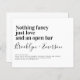 Invite friends and family to join you for your wedding celebrations with this funny wedding invitation. The text reads "Nothing fancy just love and an open bar" Please note that our range of budget wedding stationery doesn't ship with envelopes. You can order A6 envelopes from your favourite office supply store.