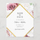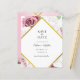 Geometric floral save the date budget card featuring a blush pink rose flowers with a gold effect geometric frame.