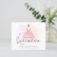 A budget price SMALLER 4.5” x 5.6” alternative. Available in a SEMI-GLOSS 110 lb CARD STOCK which is the default option (thicker for invitations), OR a SATIN FINISH 80 lb THINNER PAPER STOCK (ideal for enclosures). Envelopes are an optional extra and are slightly larger than the card size. This elegant Quinceanera design has an illustration of the back view of a girl in a beautiful pink and gold ball gown overlaid onto a watercolor wash in pinks and lemon tones. The main header is in a set script and easily personalise the rest of the text to your details.