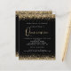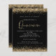 Gold Glitter Quinceañera 15th Party Black Invitation. A budget price SMALLER 4.5” x 5.6” alternative. Available in a SEMI-GLOSS 110 lb CARD STOCK which is the default option (thicker for invitations), OR a SATIN FINISH 80 lb THINNER PAPER STOCK (ideal for enclosures). Elegant gold faux glitter confetti borders are at the top and bottom and also on the back. Quinceañera is set in a modern handwriting style. Easily personalise the rest of the text to your own.