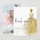 Budget Gold Gown Photo Blonde Girl Quinceañera Thank You. A budget price SMALLER 4.5” x 5.6” alternative. Available in a SEMI GLOSS 110 lb CARD STOCK which is the default option (recommended for invitations), OR a SATIN FINISH 80 lb THINNER PAPER STOCK (ideal for enclosures). Elegant style for your 15th birthday party thank yous with the backview of a girl with blonde hair in a beautiful sparkly gold dress to the right, and Thank You in a set handwritten style script. Easily personalise the rest of the text to your own details. Replace the sample photo on the back with a favourite from your party.