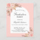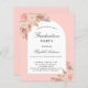 An arch frame decorated with rose gold and blush pink florals, roses and pampas grass. Personalise and add a name and details.