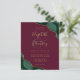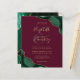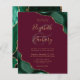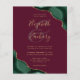 An emerald green watercolor agate design trimmed with faux gold glitter appears in two corners of this elegant design. Personalize it with the couple's names in gold-colored handwriting script over a large burgundy ampersand. Add the wedding details in gold-colored copperplate and italic fonts on a burgundy red background. The reverse side features a matching green and gold agate design