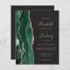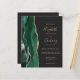 The left-hand edge of this elegant modern wedding invitation features an emerald green watercolor agate border trimmed with faux rose gold glitter. The customisable text combines rose pink handwriting, copperplate and italic fonts on a slate black background. The reverse side provides space for wedding details, along with a QR code guests can scan to visit your website and RSVP, which saves the cost of printing and mailing separate RSVP cards.