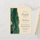 The left-hand edge of this elegant modern wedding invitation features an emerald green watercolor agate border trimmed with faux gold glitter. The customisable text combines green handwriting, copperplate and italic fonts on a champagne background. The reverse side provides space for wedding details on a solid champagne background, along with a QR code guests can scan to visit your website and RSVP.