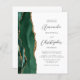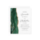The left-hand edge of this elegant modern wedding invitation features an emerald green watercolor agate border trimmed with faux gold glitter. The customizable text combines charcoal gray script and sans serif fonts on a white background. The reverse side provides space for wedding details on a solid white background, along with a QR code guests can scan to visit your website and RSVP, which saves the cost of printing and mailing separate RSVP cards.