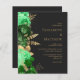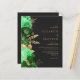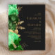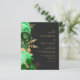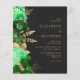 This romantic floral wedding invitation features a border of dark and light green flowers set off with gold faux foil foliage. The names of the couple appear in classic gold-coloured serif font, with the remaining text in italics, on an off-black background.