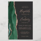 The left-hand edge of this elegant modern wedding invitation features an emerald green watercolor agate border trimmed with faux rose gold glitter. The customizable text combines rose pink handwriting, copperplate and italic fonts on an off-black background. Add additional details on the back, along with a QR code to help your guests visit your wedding website.
