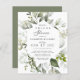This Budget Greenery Floral Bridal Shower Invitation - features black handwritten script with lush floral frame consisting of white flowers and white berries and with greenery twigs on the white background. The reverse side of the bridal invitation is dusty green.