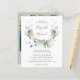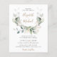 Elegant budget-friendly all-in-one wedding invitation featuring watercolors of sage green eucalyptus greenery, laurel leaves with gold accents, modern soft grey typography and your names in a stylish gold script. On the reverse side, upload your favourite engagement photo and input your wedding website address to create a QR code for your guests to scan to RSVP online and obtain additional wedding details such as directions and accommodations.