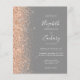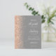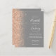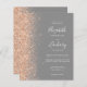 The left-hand edge of this elegant modern wedding invitation features a peach faux glitter border. The customisable text combines white handwriting, copperplate and italic fonts on a medium grey background. The reverse side features a matching peach glitter and grey design.