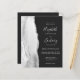 The left-hand edge of this elegant modern wedding invitation features a grey and white watercolor agate border trimmed with faux silver glitter. The customisable text combines handwriting, copperplate and italic fonts in silver grey on an off-black background. The reverse side provides space for wedding details on a solid off-black background, along with a QR code guests can scan to visit your website and RSVP.