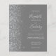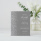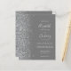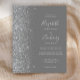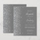 The left-hand edge of this elegant modern wedding invitation features a silver faux glitter border. The customisable text combines pale silver grey handwriting, copperplate and italic fonts on a grey background. The reverse side features a matching grey and silver design.