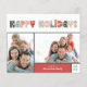 Colourful budget Christmas holiday photo card for families features two of your best family photos accented by "Happy Holidays" in whimsical multi coloured lettering. Personalise with your name and the year. The cards reverse to a fun Christmas tree pattern on a green background.