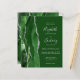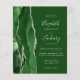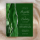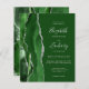 The left-hand edge of this elegant modern wedding invitation features a hunter green watercolor agate border trimmed with faux silver glitter. The customisable text combines handwriting, copperplate and italic fonts in light silver grey on a hunter green background. The reverse side features a matching green and silver agate design.