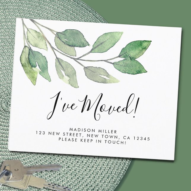 This modern moving announcement card is decorated with minimalist watercolor foliage in shades of green.