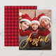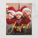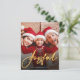 This is a budget stylish and modern holiday card printed on a flat paper sheet, using a simple photo based design with “Joyful” in an elegant gold handwritten script.