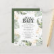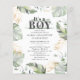 Wild, calm, and elegant boys safari animal baby shower invitation featuring a giraffe, gold effect and green leaves. Perfect for boys baby shower budget invitations