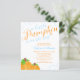 Cute little pumpkin boy budget baby shower invitations that can easily be personalised using the online template fields. A fall themed design featuring two watercolor orange pumpkins, swirls and a modern script font in blue and autumn orange.