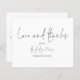 Love and Thanks Future Mrs Bridal Shower or Hen Party. A budget price SMALLER 4.5” x 5.6” alternative. Available in a SEMI GLOSS 110 lb CARD STOCK which is the default option (recommended for invitations), OR a SATIN FINISH 80 lb THINNER PAPER STOCK (ideal for enclosures). Envelopes are an optional extra and are slightly larger than the card size. Love & Thanks and The Future Mrs are set in an elegant handwriting style script on the front and the rest of the text on each side you can easily personalise with your names, and your thank you message. Shown in black and white, however can be changed to any colour of your choice via the customise further option.