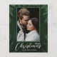 Small vertical 4.5" x 5.6" paper Christmas cards feature your favourite photo on a border of pine boughs and dots on a dark green background along with the words Merry Christmas and your names in chic lettering. These affordable holiday photo cards are printed on 110 lb paper available in 3 sizes. **WHITE ENVELOPES ARE OPTIONAL ON ORDER PAGE. Be sure to double-check your order before adding it to your cart as what you see on the screen is what will be printed. The Live Design Service can help you with your design layout if needed.