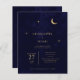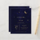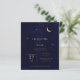 A minimalist modern celestial wedding invitation features a simple and elegant design. It includes a gold foil moon and stars that gently sparkle, set against a midnight blue background. The invitation uses classic serif typography, which adds a traditional and formal touch with its neat and clear style. The combination of modern design, shiny gold details, and timeless fonts makes the invitation both beautiful and inviting, perfect for announcing a special and elegant wedding day.