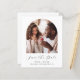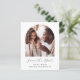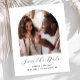This simple, minimalist Save the Date card features a boho photo arch above the words "Save the Date" in elegant black handwriting script, followed by the couple's names, wedding date and city in sans serif font on a white background. Add a more detailed message with additional information on the reverse.