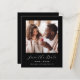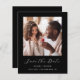 This simple, minimalist Save the Date card features a square photo above the words "Save the Date" in elegant white handwriting script, followed by the couple's names, wedding date and city in sans serif font on a black background. Add a more detailed message with additional information on the reverse.