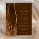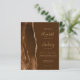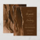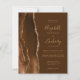 The left-hand edge of this elegant modern wedding invitation features a mocha brown watercolor agate border trimmed with faux gold glitter. The customisable text combines gold-coloured handwriting, copperplate and italic fonts on a brown background. The reverse side features a matching mocha brown and gold agate design.
