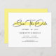 Budget Modern Minimalist Script Save The Date Invitation Card features "Save The Date" in an elegant black script over a modern yellow accent on a white background with your Save The Date information below. Personalise by editing the text in the text boxes provided. Designed for you by ©Evco Studio www.zazzle.com/store/evcostudio