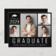 Budget-friendly minimal modern black graduation announcement featuring a 4 picture photo collage, "Graduate" written in large white letters and his or her class year, name and school or university in simple white typography.
