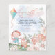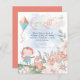 Budget Monkey Diaper Raffle Baby Shower Picnic. A budget price SMALLER 4.5” x 5.6” alternative. The SATIN FINISH 80 lb is a THINNER PAPER Stock - ideal for enclosures such as this. Also available in a SEMI-GLOSS 110 lb CARD STOCK which is thicker, similar to the weight of a postcard, so is good for invitations). Envelopes are an optional extra and are slightly larger than the card size. A lovely picnic scene with this cute monkey with her basket, cup and cake, with beautiful florals and flying kite. The header Diaper Raffle is in a set elegant script and the rest of the text you can easily personalise. A coordinating coral background is on the back.
