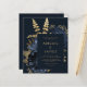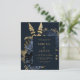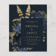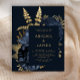 This elegant, moody wedding invitation features a lush, romantic floral bouquet in navy blue with gold faux foil and glitter foliage on a dark blue background. Customise the gold-coloured text in stylish fonts on a dark rectangle. The reverse side is solid dark blue.