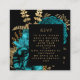 This elegant, moody wedding RSVP card features a lush, romantic floral bouquet in turquoise with gold faux foil and glitter foliage on a black background. Customise the rose pink text in stylish fonts on a black rectangle. Easily generate a QR code on the back by entering your wedding website URL.