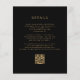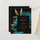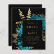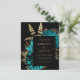 This elegant, moody wedding invitation features a lush, romantic floral bouquet in turquoise with gold faux foil and glitter foliage on a black background. Customise the gold-coloured text in stylish fonts on a dark rectangle. The reverse side provides space for wedding details on a solid black background, along with a QR code guests can scan to visit your website and RSVP, which saves the cost of printing and mailing separate RSVP cards.