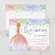 Multicolor Glitter Gown Blonde Quinceanera Invitation. A budget price SMALLER 4.5” x 5.6” alternative. Available in a SEMI GLOSS 110 lb CARD STOCK which is the default option (thicker for invitations), OR a SATIN FINISH 80 lb THINNER PAPER STOCK (ideal for enclosures). Envelopes are an optional extra and are slightly larger than the card size. Sparkly elegance for your Quinceanera with an illustration of the back view of a girl with blonde plaited hair in a beautiful pink ball gown and rainbow coloured glitter bordering the top and bottom on each side. The main header is in a set handwriting style script and easily personalise the rest of the text to your details.