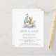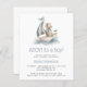 This cute baby shower invitation features a dusty blue and beige watercolor illustration of a teddy bear riding in a sailboat. The words "AHOY! It's a Boy!" and the name of the mom-to-be appear in dusty blue decorative font. The reverse side provides space for diaper raffle, books for baby, and registry details, along with a convenient QR code guests can scan to visit the registry. Ideal for a nautical-themed boy's baby shower.