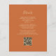 The left-hand edge of this elegant modern wedding invitation features a navy blue watercolor agate border trimmed with faux gold glitter. The customisable text combines gold-coloured handwriting, copperplate and italic fonts on a burnt orange background. The reverse side provides space for wedding details on a solid burnt orange background, along with a QR code guests can scan to visit your website and RSVP.