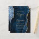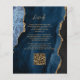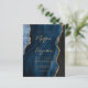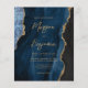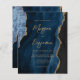 This elegant wedding invitation features a background image of navy blue watercolor agate trimmed with faux gold glitter. The customisable text combines gold-coloured modern handwriting, copperplate and italic fonts. The reverse side provides space for wedding details on a matching navy blue agate background, along with a QR code guests can scan to visit your website and RSVP, which saves the cost of printing and mailing separate RSVP cards.